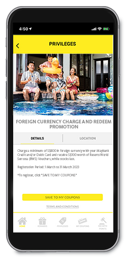 From now till 31 March 2023, receive S$100 Resorts World Sentosa (RWS) gift vouchers when you charge a minimum of S$800 in foreign currency with your Maybank Credit and/or Debit Card, while stocks last.